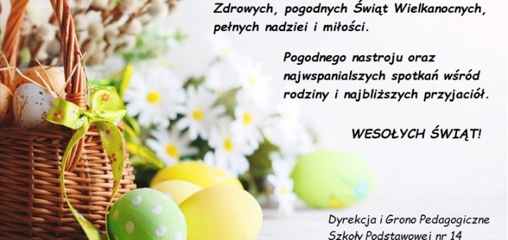 Zdrowych, pogodnych Świąt Wielkanocnych, pełnych nadziei i miłości. Pogodnego nastroju oraz najwspanialszych spotkań wśród rodziny i najbliższych przyjaciół. WESOŁYCH ŚWIĄT! Dyrekcja i Grono Pedagogiczne Szkoły Podstawowej nr 14 w Krakowie
