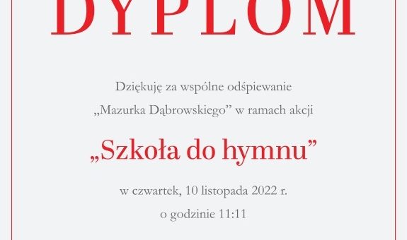 10 listopada 2022 roku o godzinie 11:11 nasza szkoła wspólnie odśpiewała „Mazurek Dąbrowskiego” w ramach akcji „Szkoła do hymnu” . PLAKAT [kliknij]
