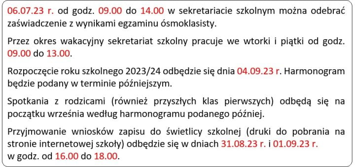 06.07.23 r. od godz. 09.00 do 14.00 w sekretariacie szkolnym można odebrać zaświadczenie z wynikami egzaminu ósmoklasisty. Przez okres wakacyjny sekretariat szkolny pracuje we wtorki i piątki od godz. 09.00 do 13.00. Rozpoczęcie roku...