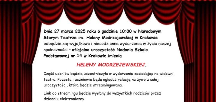 Dnia 27 marca 2025 roku o godzinie 10:00 w Narodowym Starym Teatrze im. Heleny Modrzejewskiej w Krakowie odbędzie się wyjątkowe i niecodzienne wydarzenie w życiu naszej społeczności – oficjalna uroczystość Nadania Szkole Podstawowej nr...