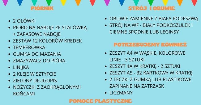 PIÓRNIK: 2 ołówki, pióro na naboje ze stalówka + zapasowe naboje, zestaw 12 kolorów kredek, temperówka, gumka do mazania, zmazywacz do pióra, linijka, 2 kleje w sztyfcie, zielony długopis, nożyczki z zaokrąglonymi końcami. STRÓJ...