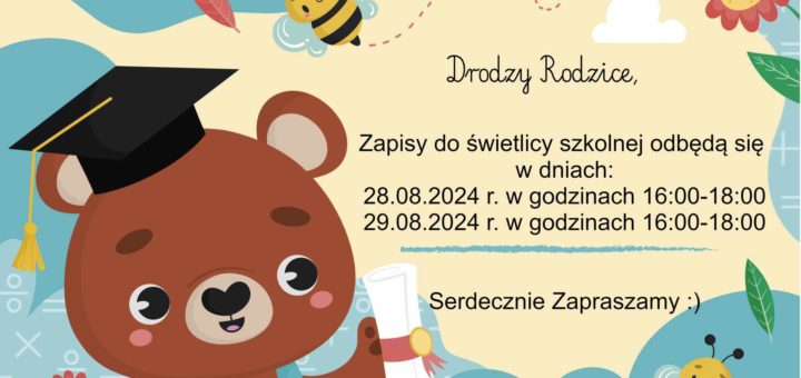 Drodzy Rodzice, zapisy do świetlicy szkolnej odbędą się w dniach: 28.08.2024 r. w godzinach 16:00-18:00, 29.08.2024 r. w godzinach 16:00-18:00. Serdecznie zapraszamy:)