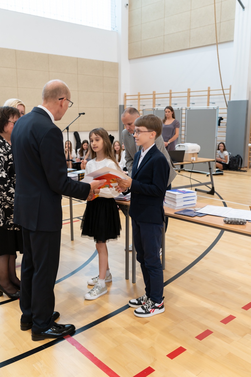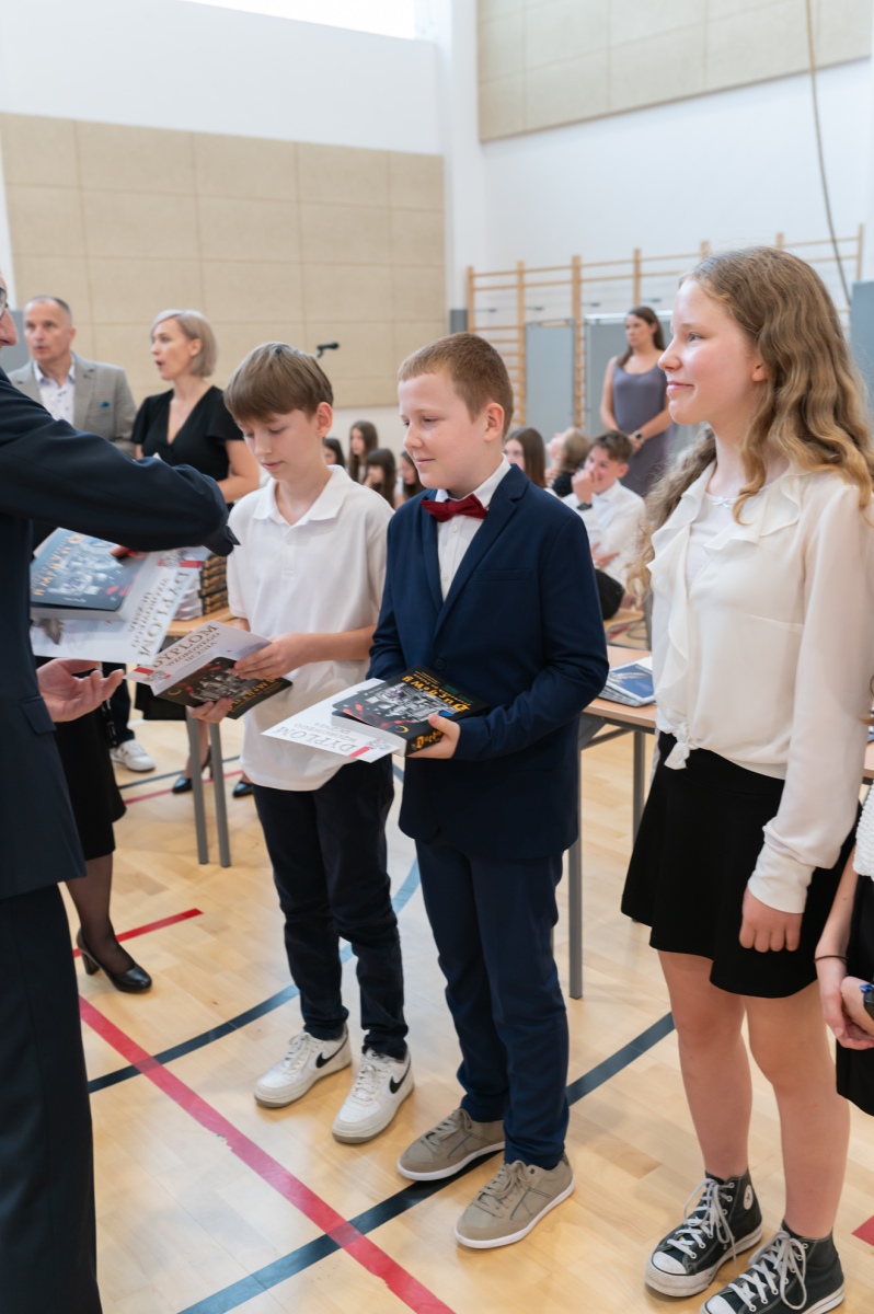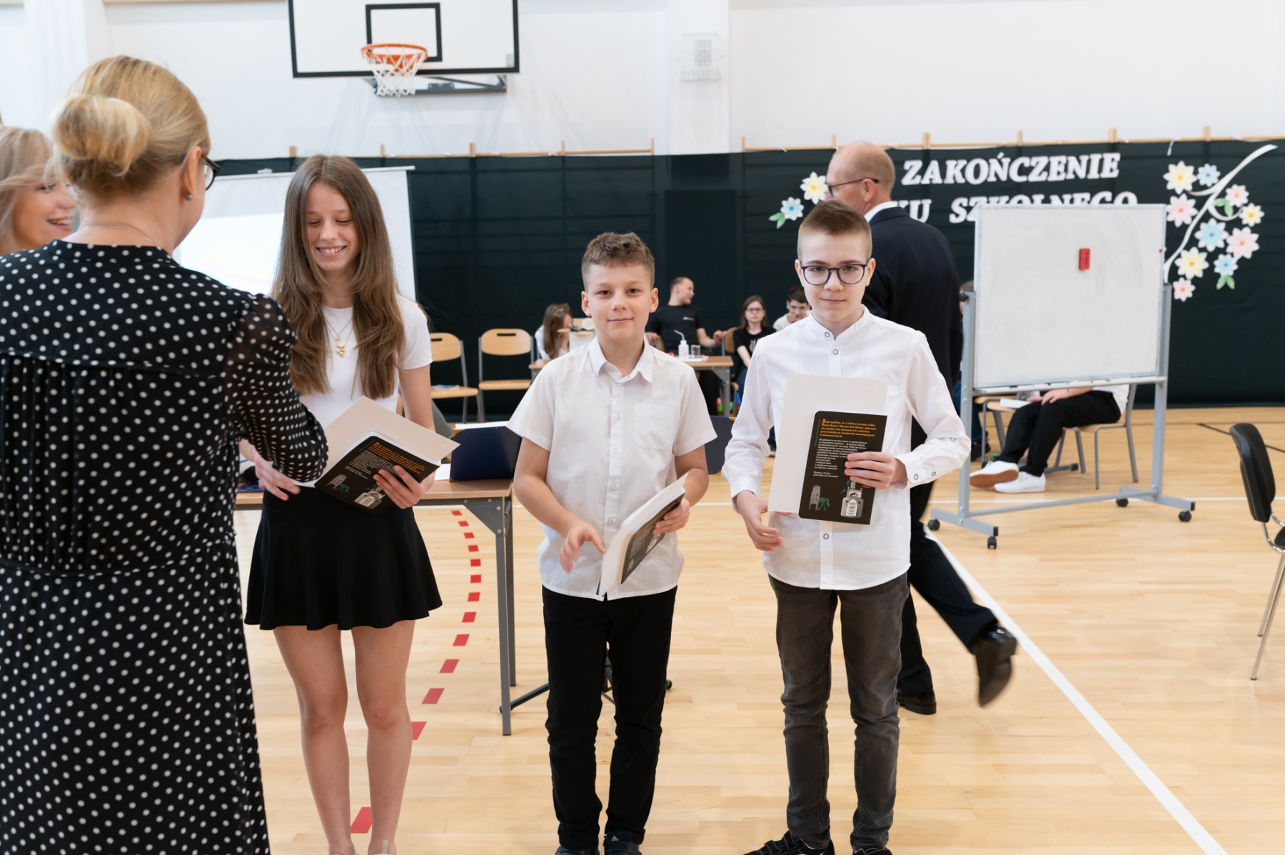 W piątek uczniowie, którzy uzyskali średnią nie niższą niż 5,0 i zachowanie wzorowe, odebrali nagrody i listy gratulacyjne z rąk naszej Dyrekcji oraz wychowawców poszczególnych oddziałów. Z łezką w oku pożegnaliśmy uczniów klas ósmych. Z tej okazji klasy siódme pod przewodnictwem Pani Renaty Rosołek i Pani Sylwii Łapcik przygotowały piękny program artystyczny. Nad muzyczną oprawą czuwał Pan Marcin Głąb wraz ze szkolnym chórem.
